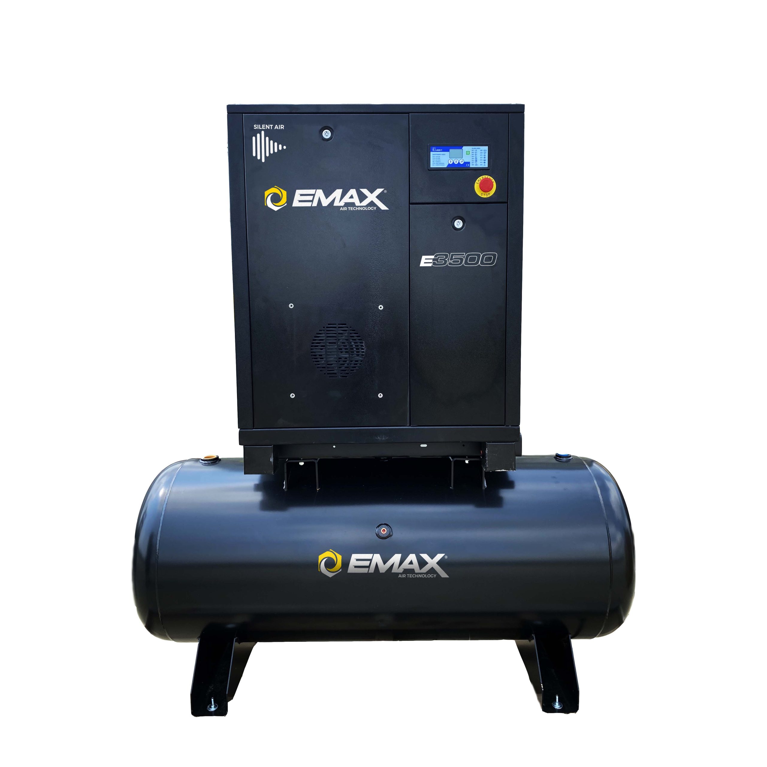 EMAX 15HP 3PH 208V 56CFM Fixed Speed Industrial Rotary Screw Compressor mounted on a 120 Gal horizontal tank