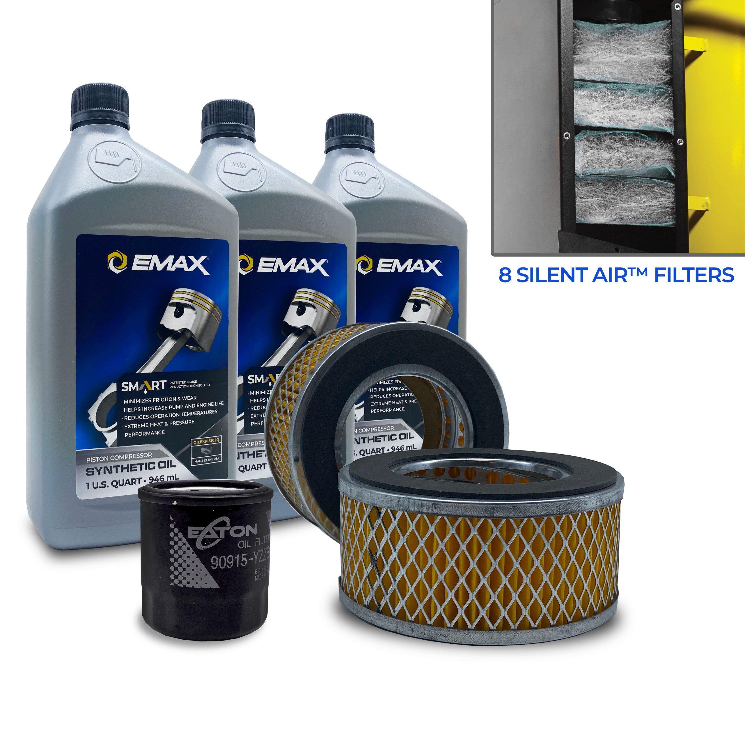 EMAX 5YR Extended Silent Air Warranty Filter Maintenance kits for 15hp – 20hp Piston Compressors, includes (3) OILEXPIS102Q (2) FILTER058 (8) FILTER107 (1) FILTER125 Oil Filter