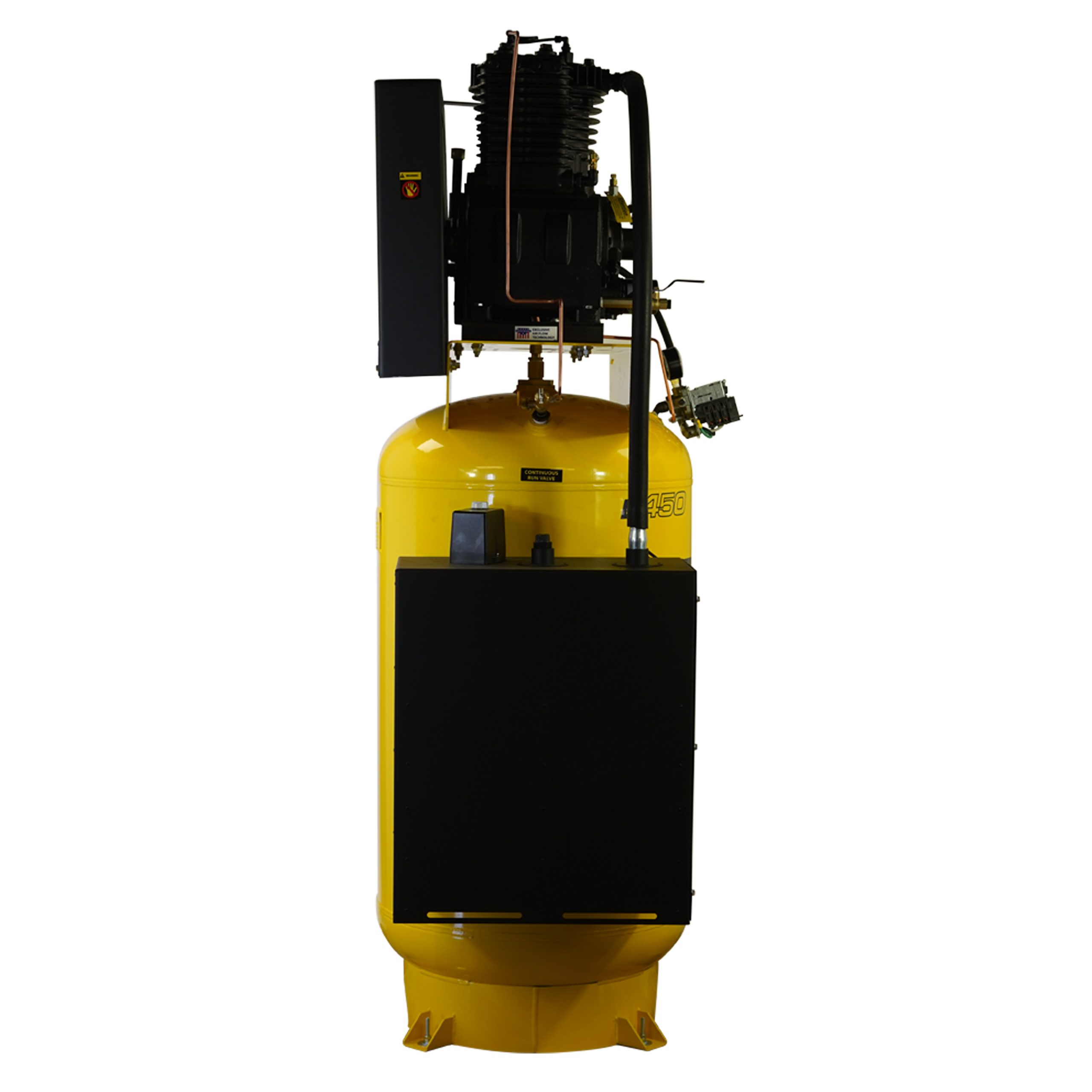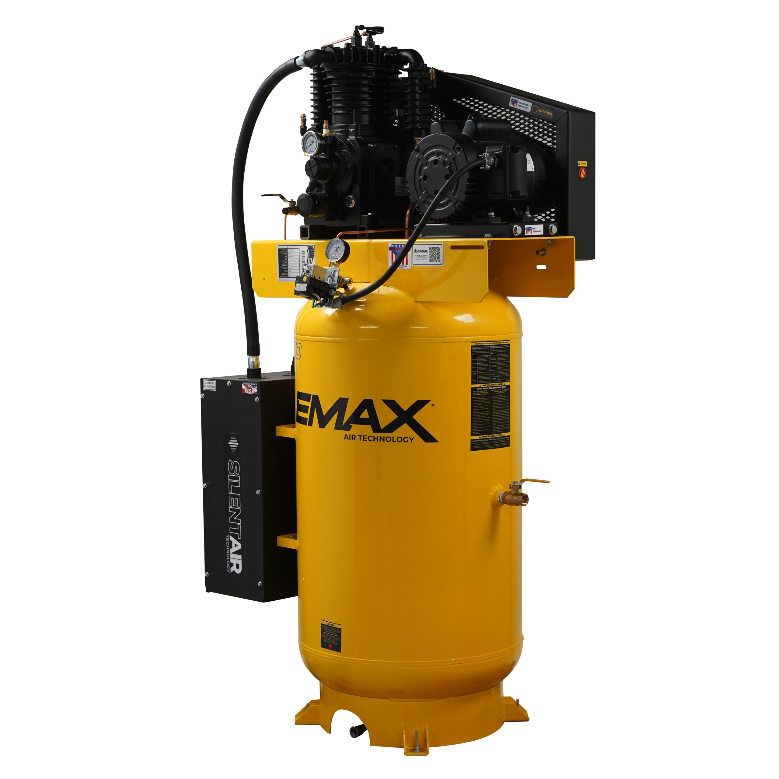 EMAX Silent Air Industrial 15HP 3CYL 57CFM 3- Phase 208/230V 2-Stage 120 Gal. Vertical Stationary Electric Air Compressor-W/ Pressure Lube Pump , Isolator Pads, Belt Tensioner, Continuous Run, Auto Drain W/Radiator After Coolers