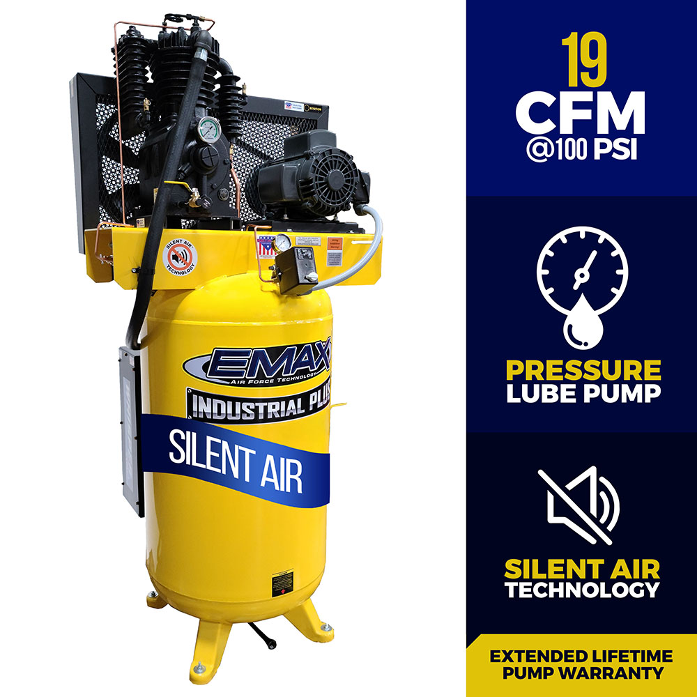 EMAX Silent Air Industrial Plus 5HP 19CFM 1- Phase 2-Stage 80 Gal. Vertical Stationary Electric Air Compressor-W/ Pressure Lube Pump , Isolator Pads, Belt Tensioner, Continuous Run, Auto Drain